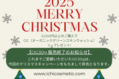 2025/12/04 ニュース 【お知らせ】オーガニック グリーンスキンウォッシュ30g 販売終了と感謝のプレゼント いつもICHI化粧品をご愛顧いただき、ありがとうございます。 早いもので今年も12月を迎え、一年の締めくくりの時期となりました。 このたび、長くご愛用いただいておりました オーガニックグリーンスキンウォッシュ30gの販売 ...