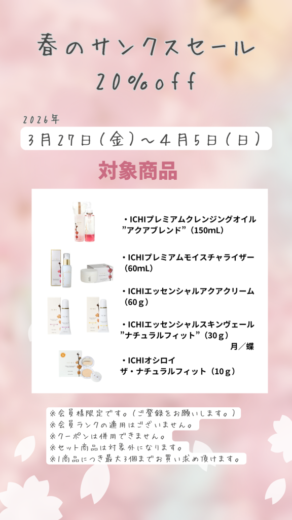 さて、ICHI化粧品では、この春の訪れを祝し、皆様に麗らかな気分でお過ごしいただけるよう、期間限定で「春のサンクスセール20%OFF」を開催いたします。